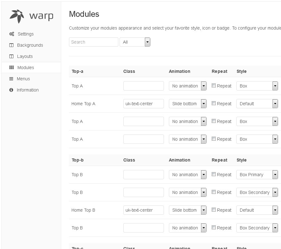 The style section contains the customizer. Hit the Customizer button to add your own style or to modify an existing style. After the customizer is loaded, you can easily customize colors, fonts, margins and even more settings of the theme. The customizer saves only the modified variables and automatically compiles them into CSS.